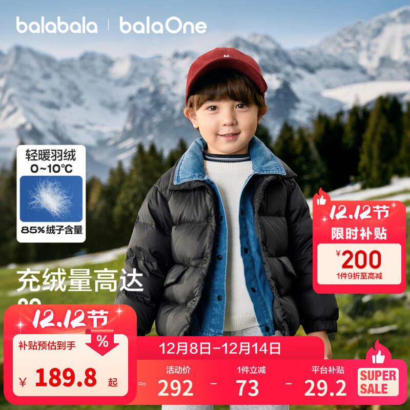 包邮 巴拉巴拉童装儿童羽绒服男女童2025新款宝宝冬装拼接外套三防保暖上衣百搭 黑色牛仔-灰鸭绒-85%绒子 110 充绒量70g
